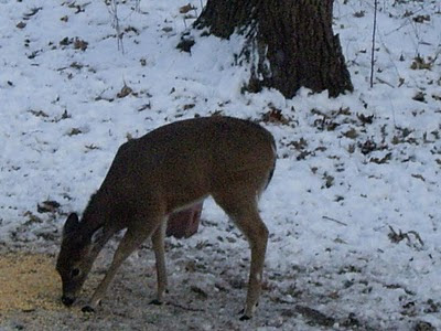 My hubby and I live in the middle of 3 acres in a Missouri woodland west of St. Louis. This home site has given us a great opportunity to observe many of the areas critters. Our backyard is always hopping with activity all year long. We provide feeding stations and water, the natural woodland provides shelter for our backyard habitat. Our feeding stations cater to the bird population from the smallest finch to the turkey. We have one feeding station that now is drawing a big crowd. We ground feed with cracked corn in the winter months. This attracts the Cardinals, Blue jays, Doves, Squirrels and Turkey to name a few. But the main attraction arrives in the late afternoon/early evening when a group of 1 to 3 deer arrive. There is usually 2 large deer and 1 smaller. They will enjoy the corn undisturbed for quite a while. The snows have made them stay longer at the diner, but we can count on "the girls" arriving every evening. Last night was an exception. As usual "the girls" showed up at the usual time and we are able to watch them as we prepare our own evening meal. But, as night was falling and the "the girls" were becoming shadows, my hubby calls out that more were coming out of the woods. We had so many it was hard to count, at our best we could see 9 deer showing up at the diner for a meal. There were 6 eating at one time. This is the first time we have had so many at one time in the yard. I'm sure the snows are bringing them out or maybe they hear there was good eating at the diner. Today we are going to create a few more feeding stations for the corn---so everyone one can have a spot. I just looked outside and the corn is gone--I have a feeling we also had night visitors.
